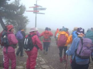 霧が深く、途中雨になるかも知れないと雨具をつけて出発